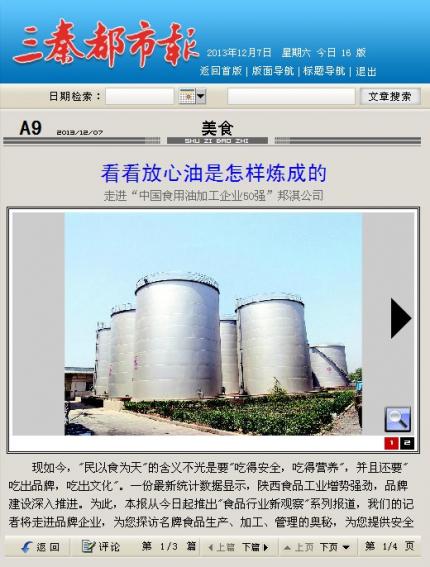 現(xiàn)如今,"民以食為天"的含義不光是要"吃得安全,吃得營(yíng)養(yǎng)",并且還要"吃出品牌,吃出文化"。一份最新統(tǒng)計(jì)數(shù)據(jù)顯示,陜西食品工業(yè)增勢(shì)強(qiáng)勁,品牌建設(shè)深入推進(jìn)。為此,本報(bào)從今日起推出"食品行業(yè)新觀察"系列報(bào)道,我們的記者將走進(jìn)品牌企業(yè),為您探訪名牌食品生產(chǎn)、加工、管理的奧秘,為您提供安全消費(fèi)、放心消費(fèi)、健康消費(fèi)、時(shí)尚消費(fèi)指南。今日首期推出來(lái)自西安邦淇制油科技有限公司和多美滋嬰幼兒食品有限公司的報(bào)道。