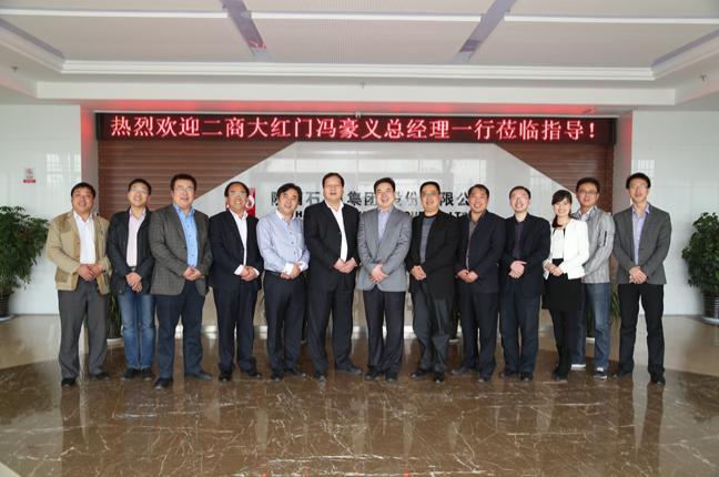 4月4日12時北京二商集團(tuán)大紅門肉類食品有限公司總經(jīng)理馮豪義、蒲城大紅門公司總經(jīng)理薛克來等一行五人蒞臨石羊集團(tuán)總部參觀交流,集團(tuán)總裁常青山、副總裁韓春元、油脂事業(yè)部總經(jīng)理孔紅民等有關(guān)領(lǐng)導(dǎo)接見會談。